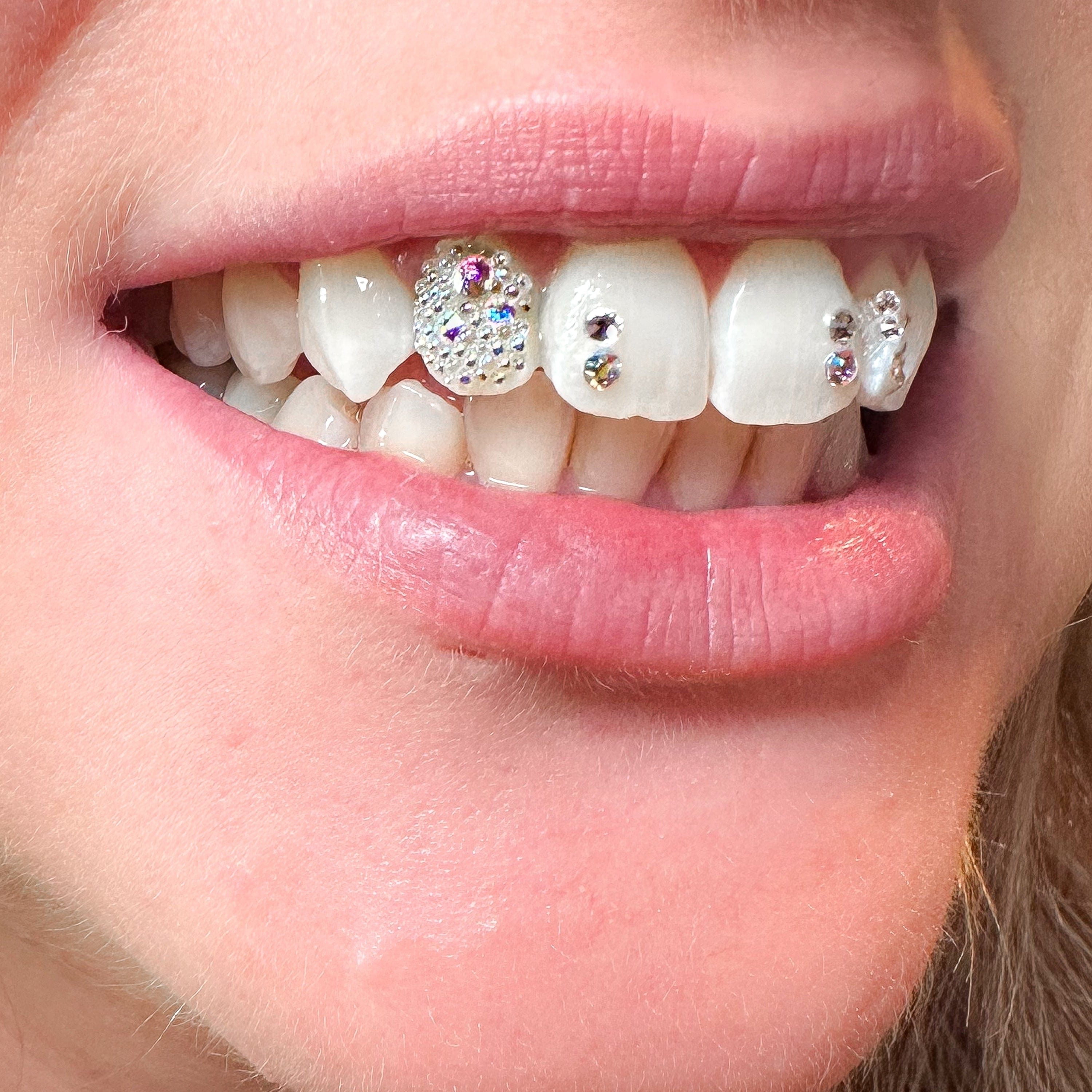 Unfortunately, tooth gems do not bond well to porcelain or ceramic surfaces and won’t stay for the long term. If you have a mix of natural tooth tissue and veneers, we can apply crystals to the natural teeth around them instead.